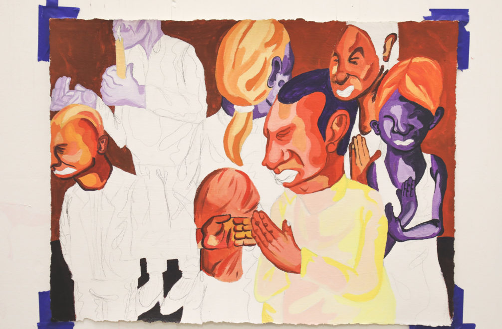 Woody De Othello。鮮やかでセンセーショナルとも言える色使いを作風とし、彫刻や絵画作品に表現された弱さやもろさによって見る者とつながっています。高く評価されるサンフランシスコのカリフォルニア・カレッジ・オブ・アーツを卒業後、全米各地での個展、グループ展で成功を収めています。サンフランシスコにあるミネソタ・ストリート・プロジェクト・スタジオでのリキテックスのリサーチ・レジデンシーでは、リキテックスのカドミウムフリー(不使用)色の品質の高さと、作品でよく取り上げている人物像の再現性を認識するきっかけになりました。